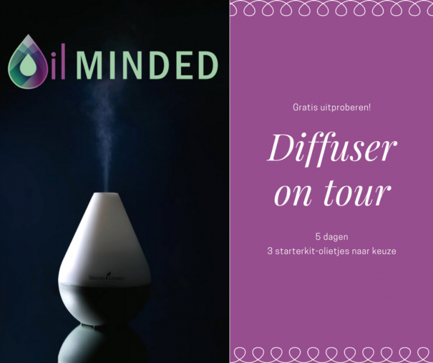 Oil Minded biedt je de mogelijkheid om de diffuser 1 week gratis uit te proberen met 3 oliën uit de starterkit naar keuze. Dus wil je rust en meer aarding? Dan krijg je bijvoorbeeld Frankincense, Orange en Lavender mee. Wil je juist meer concentratie en focus? Dan zijn Stress Away, Peppermint en Lemon mooie oliën om uit te proberen. Of blijft iedereen in huis maar kuchen? Probeer dan eens of Thieves, Purification en RC jullie er sneller doorheen kunnen helpen. En wil je een goede nachtrust? Kijk dan eens of de diffuser naast je bed met bijvoorbeeld Stress Away, Lavender en/of Orange verschil maakt. Vertel waarbij je ondersteuning zoekt en je krijgt de juiste combinatie mee.